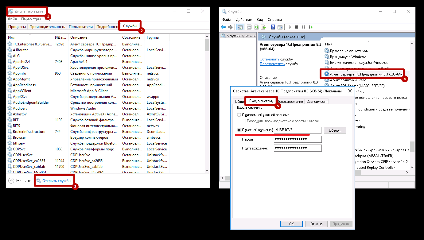 1. Проходим на сервере аутентификацию под пользователем, под которым запускается служба "Агент сервера 1С:Предприятия".