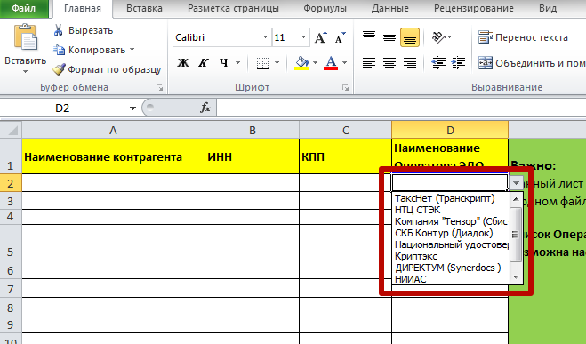 Обратите внимание, что заполнять поле "Наименование оператора ЭДО" необходимо с помощью варианта из выпадающего списка для каждого контрагента (не копированием-вставкой):