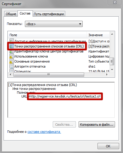 2. Открыть файл сертификата и перейти на закладку "Состав". Найти поле "Точки распространения списков отзыва (CRL)" и скопировать ссылку на список отзыва Удостоверяющего Центра (ссылка должна заканчиваться на .crl):