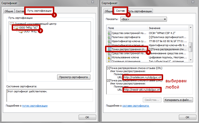 Если после этой процедуры ошибка не исчезнет, рекомендуем дополнительно скачать и установить список отзыва Головного Удостоверяющего Центра. Для этого нужно зайти в файл скаченного сертификата (см. пункт 1 данной инструкции), перейти на закладку "Путь сертификации" и открыть сертификат Удостоверяющего Центра (как правило, он располагается посередине цепочки сертификации). Ссылку на список отзыва ищем по аналогии с пунктом 2 данной инструкции: