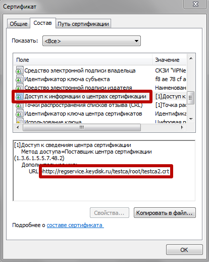 2. Открыть файл сертификата и перейти на закладку "Состав". Найти поле "Доступ к информации о центрах сертификации" и скопировать ссылку на сертификат Удостоверяющего Центра (ссылка должна заканчиваться на .crt или .cer):
