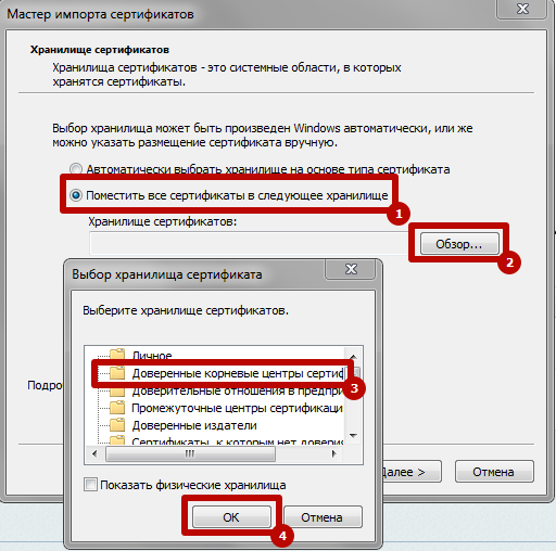 4. Открыть файл скаченного корневого сертификата и нажать кнопку "Установить сертификат...". В "Мастере импорта сертификатов" на этапе определения хранилища необходимо выбрать пункт "Поместить все сертификаты в следующее хранилище" и указать хранилище "Доверенные корневые центры сертификации":